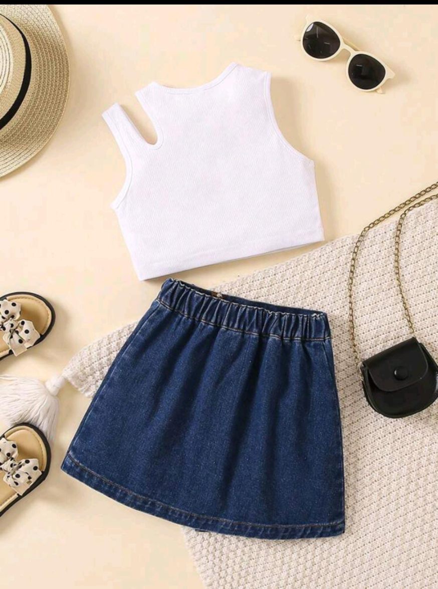 Conjunto con falda de mezclilla.
