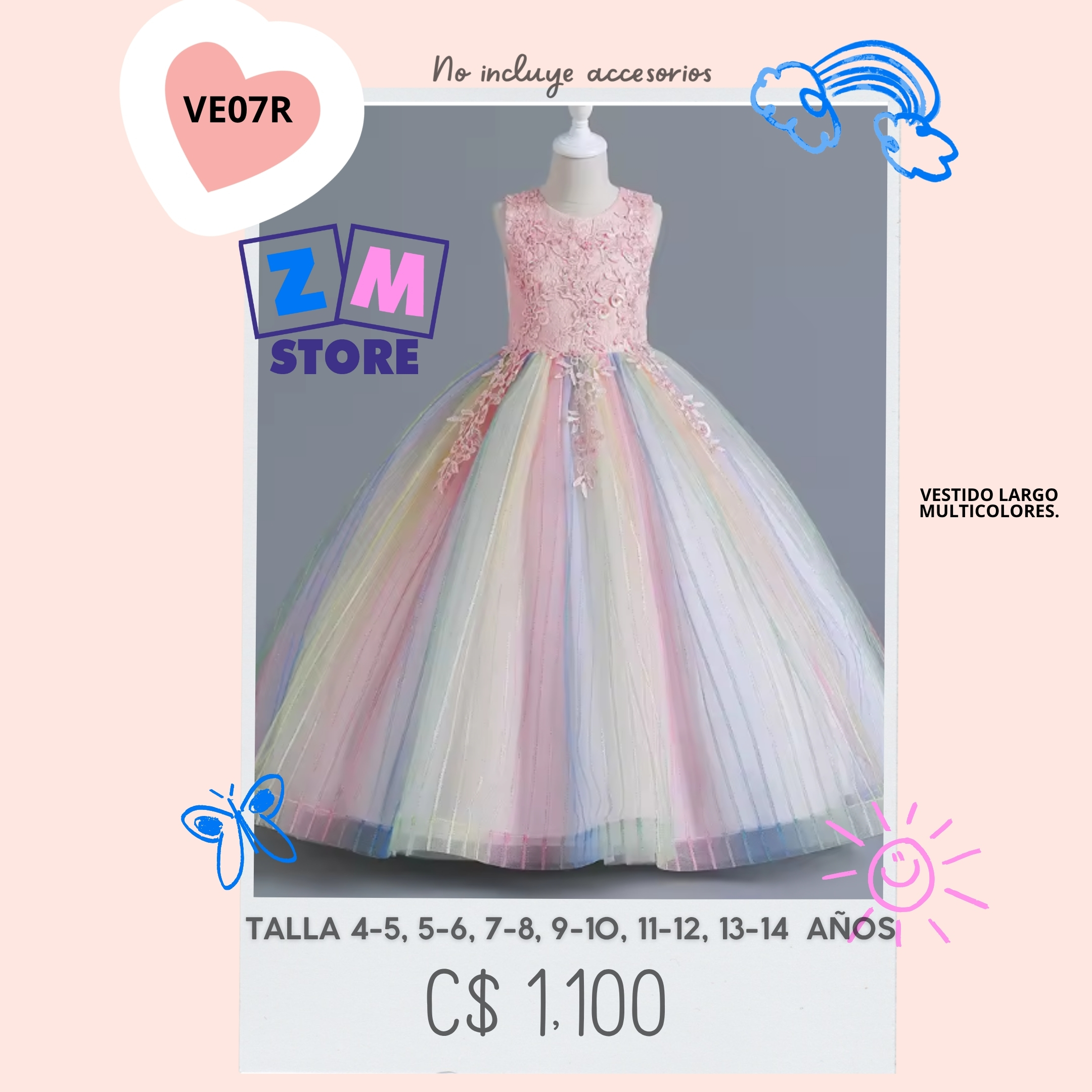 Vestido de princesa para niñas con flores. falda muticolor.